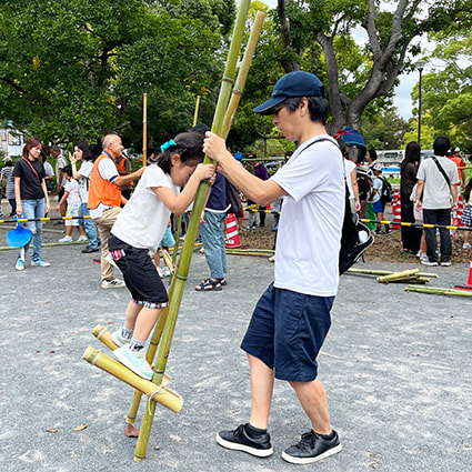 まずは、切った竹はあそび道具になります。竹馬、竹とんぼ、竹でっぽう、竹の水鉄砲、竹ポックリ、竹返し、竹の楽器…。実にたくさんありますね!昔は、こうした自然素材を活用したあそびがたくさんありました。あそび場も自然の中でした。こうしたあそびでしか養えないものがたくさんあります。親子で、竹林で竹あそび!いかがでしょうか。