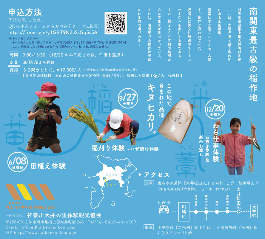 ①2024年6月15日(土) 9:00-13:30|田植え体験 ②2024年9月29日(日) 9:00-13:30|稲刈り・ハザ掛け体験 ③2024年12月22日(日) 9:00-11:30または13:00-15:30 わら仕事/正月飾りづくり体験・米の石貫き体験&新米お渡し(オリジナル米袋づくり) ※雨天時、田植え6/16(日)、稲刈り10/6(日)に延期 ※12/22は室内/半日(午前または午後)となります(選択制・先着順) 場所:足柄上郡大井町山田地区の田んぼ 内容:圃場整備されていない「里山の田んぼ」にて田植え・稲刈り体験。 定員:20組/80名程度 費用:全3回分として¥10,000/人(小学生以上|幼児は保護者同伴要) 3回分の体験料、「ご当地・里山弁当」と「足柄茶」 (田植え/稲刈りの2食分)、収穫した新米2㎏/人、保険料 申込:こちらからお申込みください |