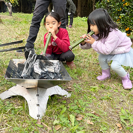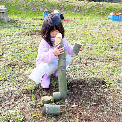 まずは、切った竹はあそび道具になります。竹馬、竹とんぼ、竹でっぽう、竹の水鉄砲、竹ポックリ、竹返し、竹の楽器…。実にたくさんありますね!昔は、こうした自然素材を活用したあそびがたくさんありました。あそび場も自然の中でした。こうしたあそびでしか養えないものがたくさんあります。親子で、竹林で竹あそび!いかがでしょうか。